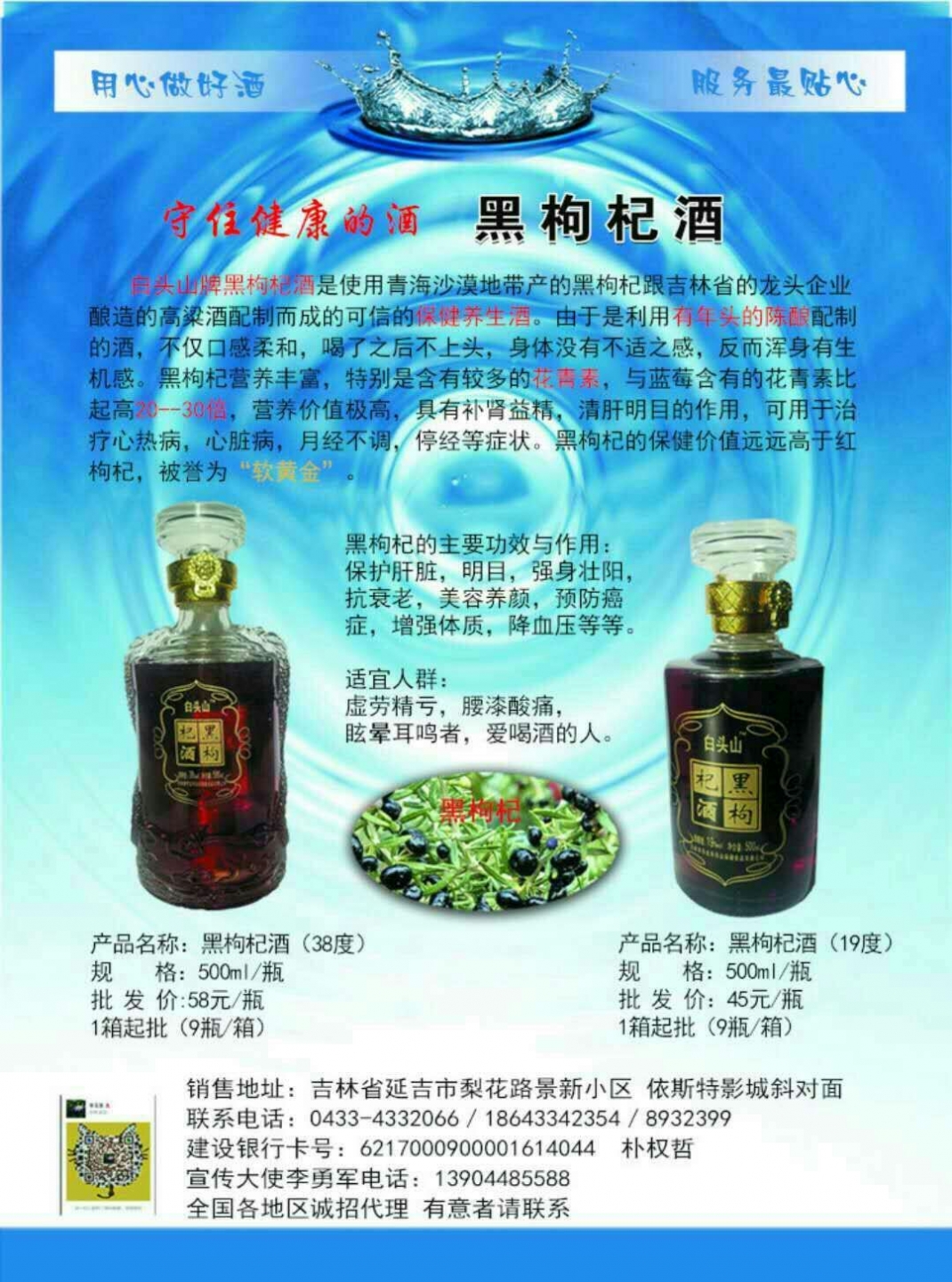 흑구기자는 중국의 서북부 사막지대와 구라파주의일부 지방에서만 재배되느 것으로 영양이 풍부하여 많은 사람들에게 각광을 받고 있는 건강식품으로 직접 흑구기자를 이용해서 담구고 사과와 배즙으로 당도와 도수를 조절한 좋은 술입니다. 38도와 19도 두가지 종류가 있습니다, 흑구기자꿀차는 38도짜리 순피나무꿀과 흑구기자추출물 진피원액으로 배합제조된 것으로 맛과 향이 좋습니다. |